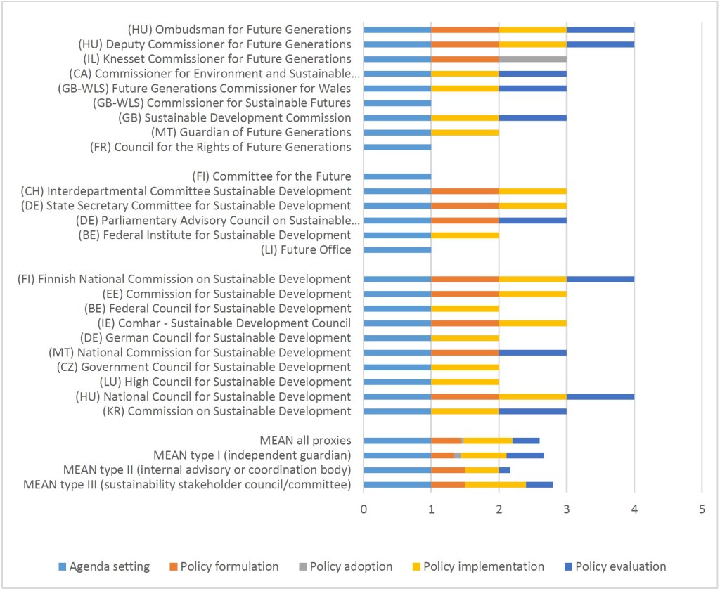 Type II proxies – the political or administrative advisory or coordination bodies – are, to a certain extent, the counter-model to type I. They are not independent, but internal parts of the political system, comprising either Members of Parliament or members of the governmental departments. Operating on a predominantly weak legal footing, they provide internal advisory, coordination, and sometimes monitoring services to enhance political decision-making from within, with a view toward benefitting future generations. They only have limited political instruments at their disposal and can access only few stages of the policy cycle, which makes them heavily reliant on good working relationships with other parts of parliament and government.
