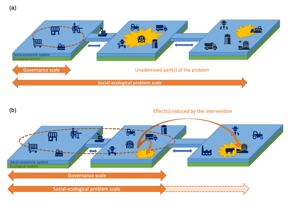 Governance institutions address a social-ecological problem but create leakage(s), i.e., counterproductive effects outside the targeted area or domain of the intervention